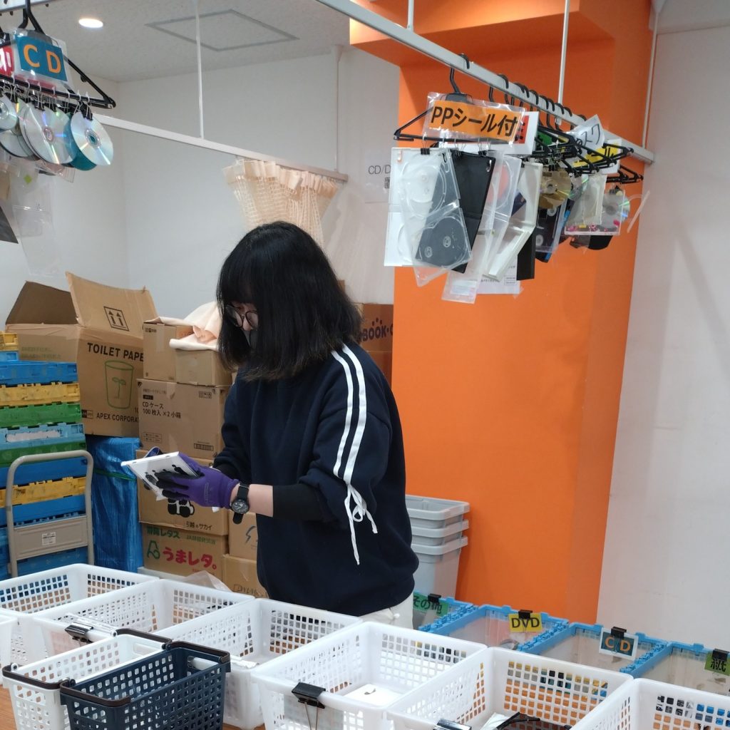 CDやDVDのパッケージを、プラスチック素材や付属の紙ごとに分別する、手順が明確な作業です。